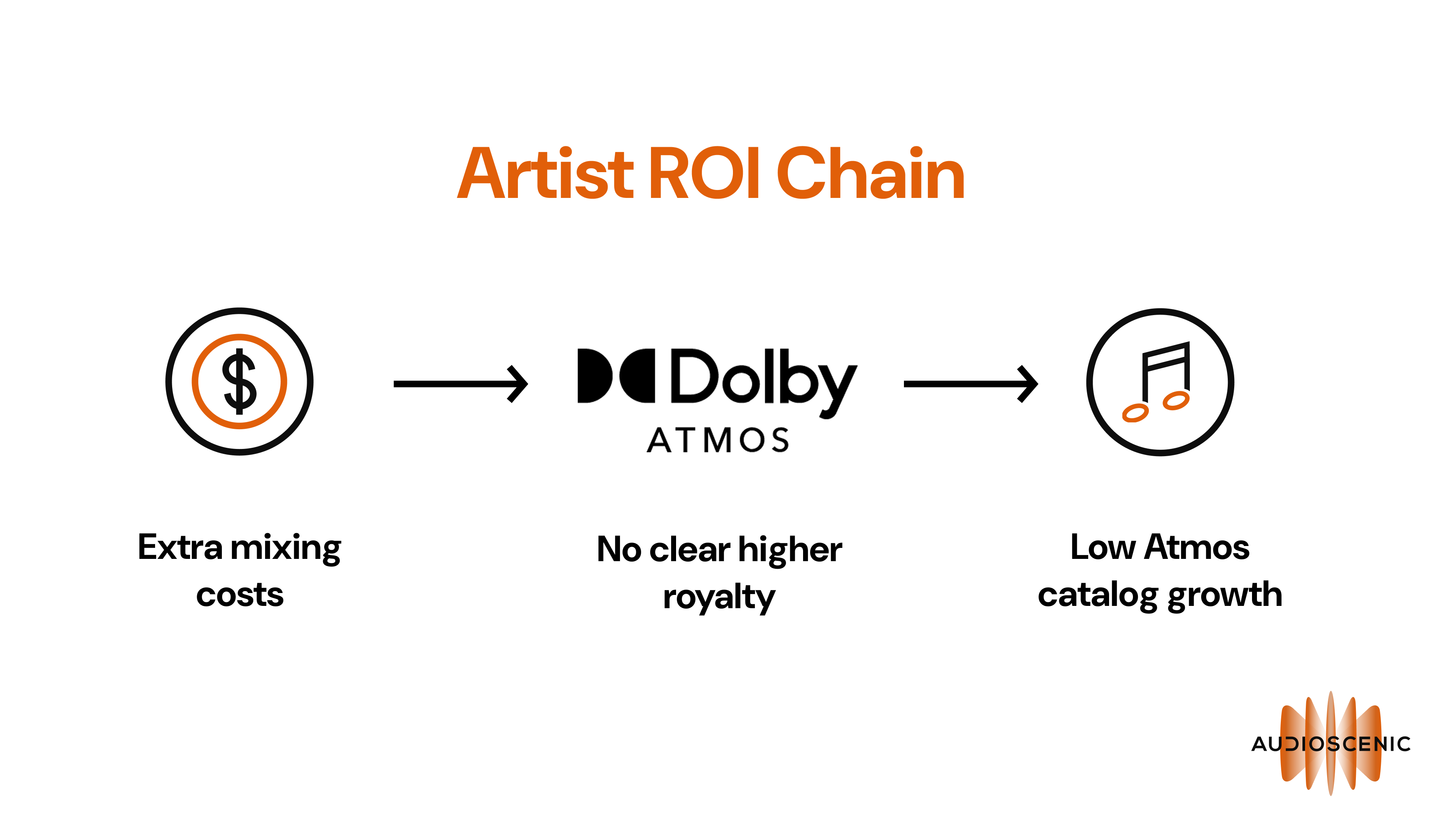 Apple seems to stand alone in offering 10% higher royalties for tracks mixed in Atmos, and with a reported value per listen of $0.0076, the direct return on investment even for the highest performing artists is negligible.